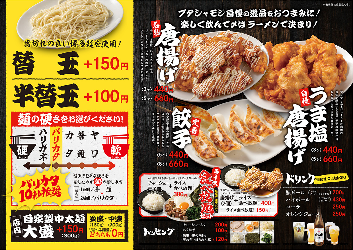 豚骨を長時間炊いた濃厚なスープに、お店で作る特製麺を合わせた豚ソバが評判。豚ソバの麺は並盛りでも150gとボリューム満点。+150円でごはんが食べ放題になるサービスもあり、満腹になること間違いなし!