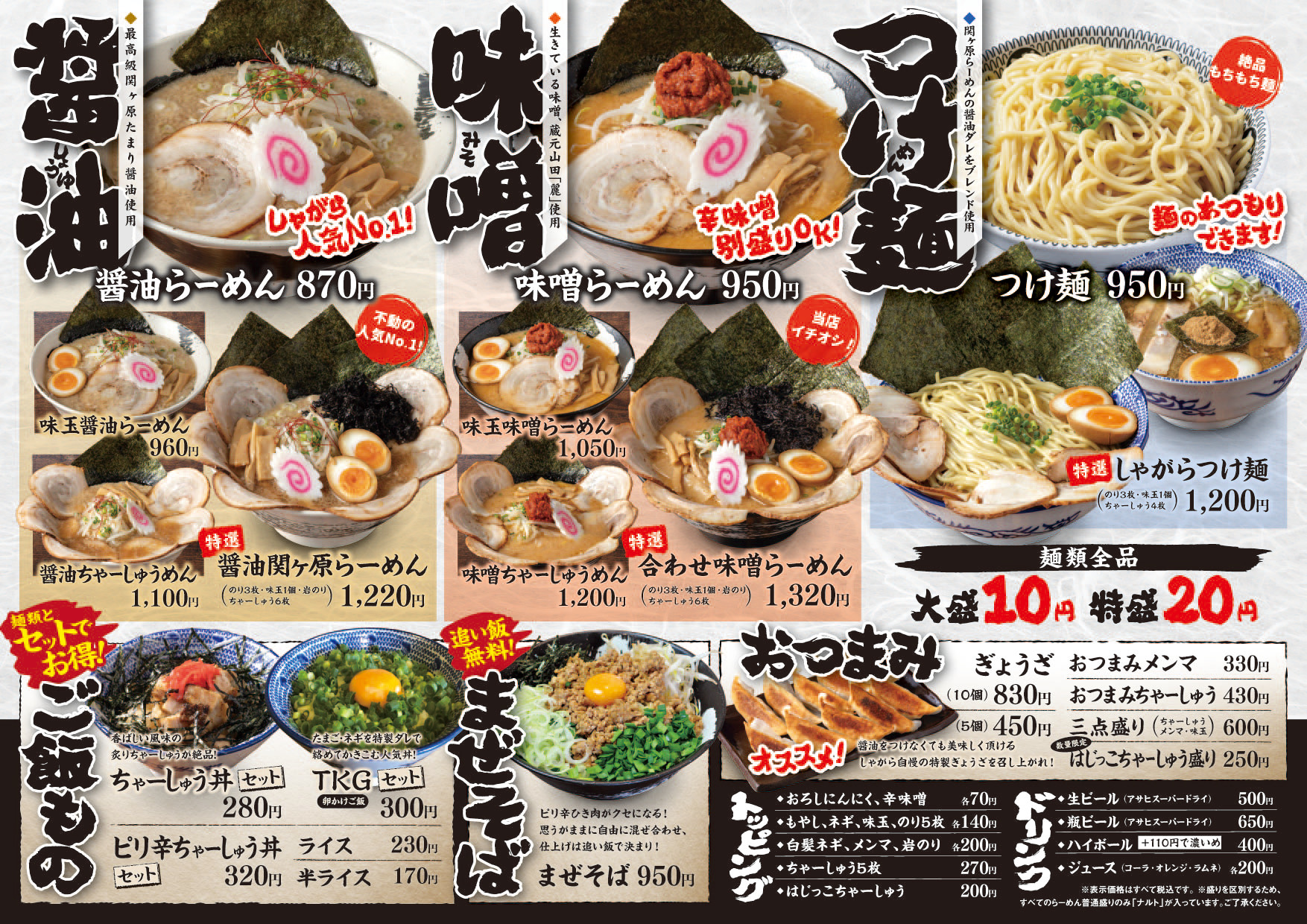 麺の大盛り10円、麺の特盛り20円の、しゃがら1号店