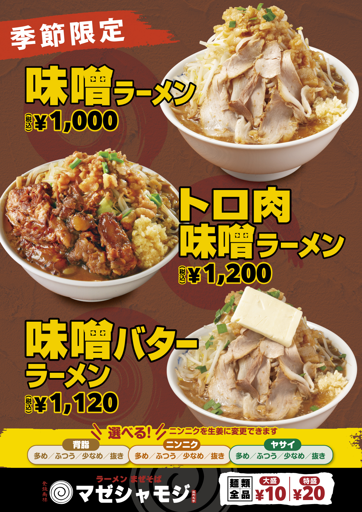 2025年11月21日(金)より「味噌ラーメン」「トロ肉味噌ラーメン」「味噌バターラーメン」を期間限定で販売いたします。